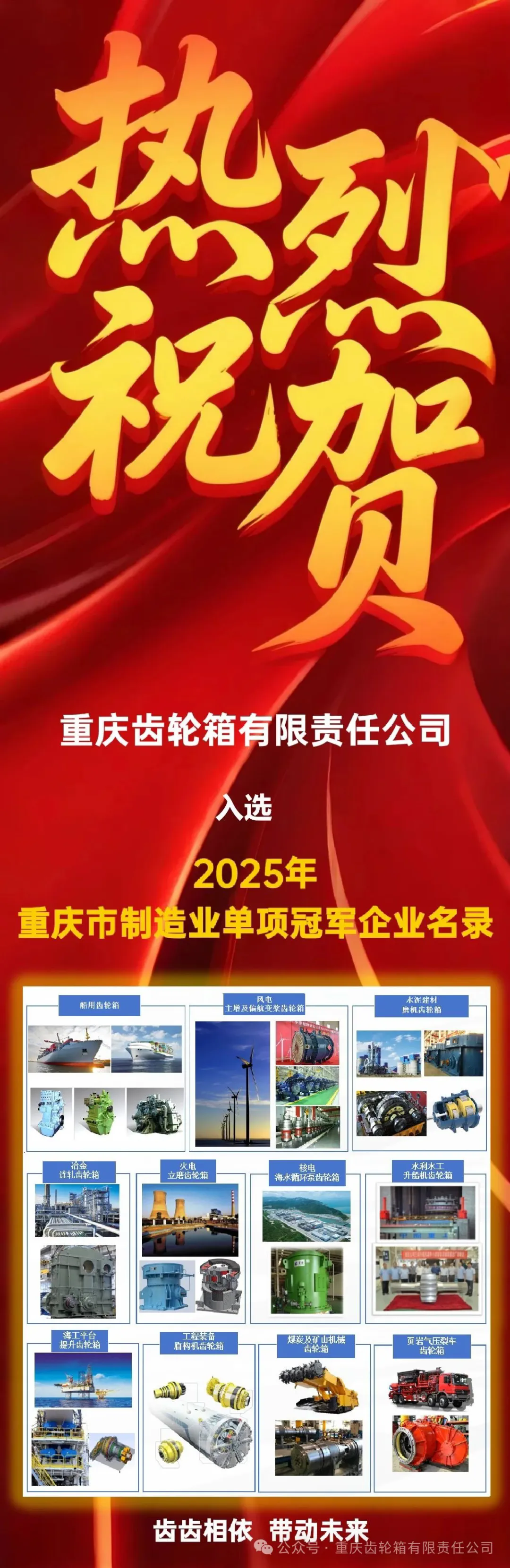 近日,重慶市經(jīng)濟信息委公布了2025年度重慶市制造業(yè)單項冠軍企業(yè)名錄,共30家企業(yè)入選,重慶齒輪箱有限責任公司作為一家有著近60年研發(fā)和制造高、低速重載齒輪箱為主的大型專業(yè)化企業(yè),名列其中!